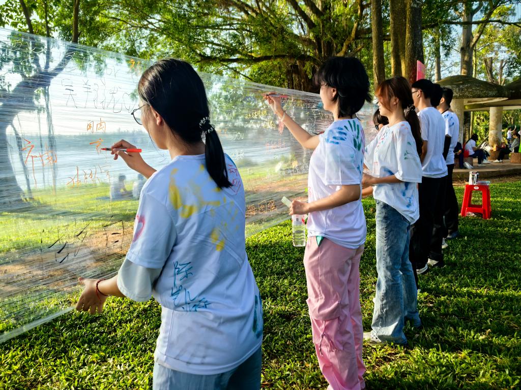 漆心相印环节中,同学们在扇面上挥洒创意,用斑斓色彩勾勒心意,在动手实践中收获成就感;膜法留言环节里,透明膜上写满对个人成长的期许与对学校校庆的祝福,字里行间饱含深情;记忆消消乐与专注力挑战环节,通过趣味任务锻炼同学们的思维敏捷度与专注力,在闯关过程中激发潜能;情绪传递站环节,4~6人组队协作,以肢体动作、面部表情传递情绪,在默契配合中增进彼此情谊;印掌跑环节,工作人员用颜料在奔跑者的白色T恤上印下专属掌印,让每一份参与都留下独一无二的色彩纪念。