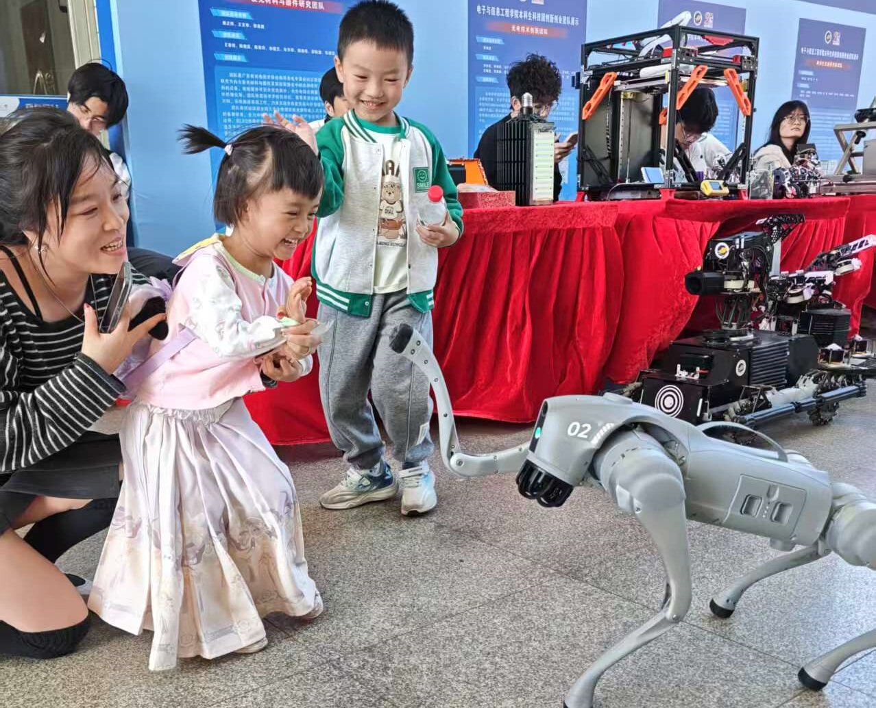 活动现场,一位位特殊的“小访客”格外引人注目。跟随校友前来的孩子们,对活泼可爱的机器狗表现出了极大的兴趣。他们围在机器狗旁边,眼睛里闪烁着好奇与兴奋的光芒,时而发出欢快的笑声,时而大胆地伸手互动。这生动的一幕,正是科技魅力最直接的传递。一颗名为“科技”的种子,或许就在这一刻,悄然埋进了这些幼小的心灵中。我们相信,今日的好奇,必将孕育明日的探索。母校九十年积淀的学术精神与创新文化,正通过这样生动的方式,实现着跨越代际的传承。