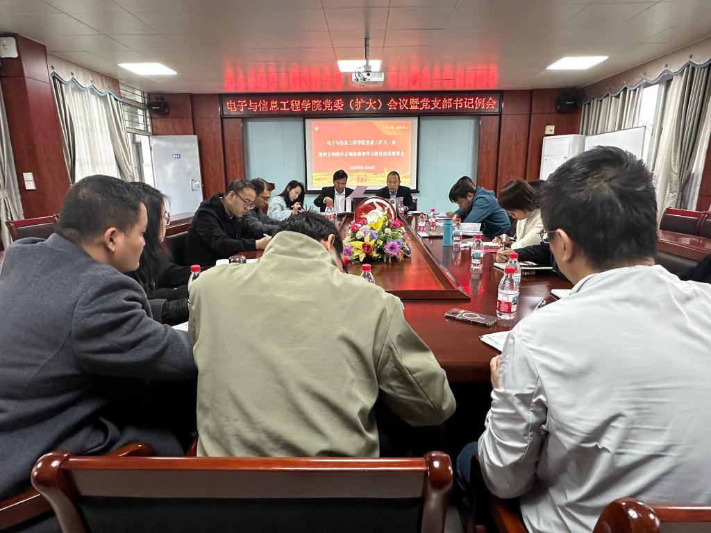 3月4日下午,电子与信息工程学院党委召开党委(扩大)会议,深入学习贯彻习近平总书记关于树立和践行正确政绩观的重要论述精神,传达学习中央及省委有关文件有关会议精神,对学院学习教育进行动员部署,学院党委书记欧卫军主持会议并讲话,学院领导班子成员、各党支部书记及组织员参加会议。