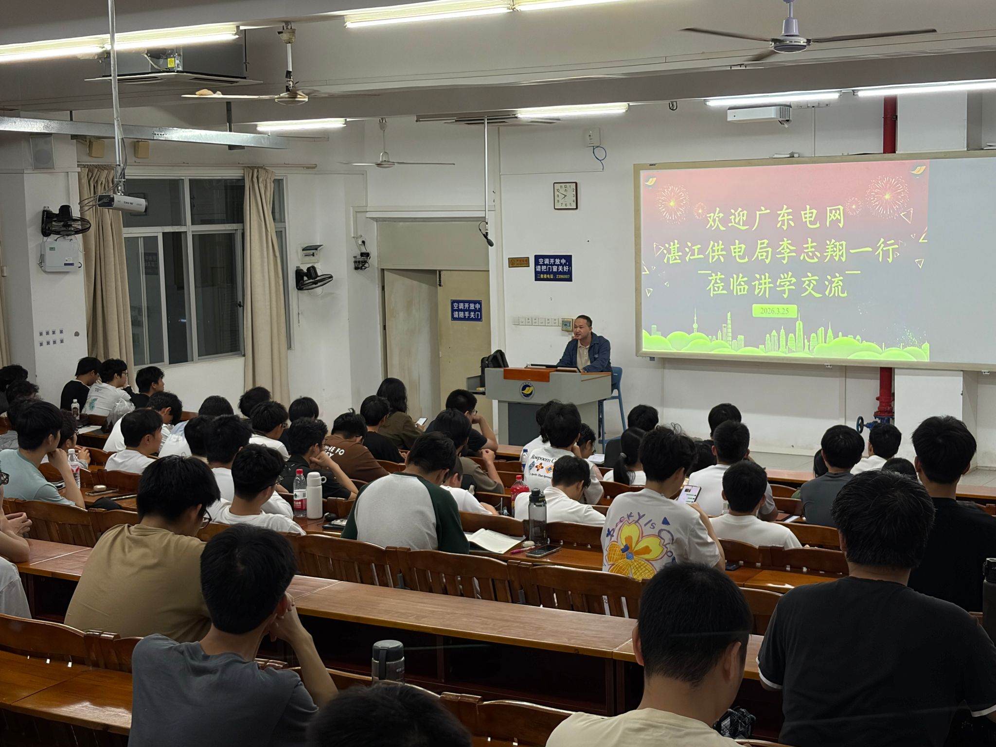 3月25日的分享会聚焦电力行业发展与就业指导,湛江供电局科技创新专责李志翔结合自身在科技项目研发、知识产权管理及核心技术布局中的丰富实践经验,围绕电力行业创新发展趋势、行业人才需求导向展开深入解读。他详细拆解了电网招聘笔试重点、备考方法与应试技巧,系统介绍了电网系统岗位设置、职业发展路径及行业前沿技术动态,鼓励同学们在专业学习中深耕细作,主动培养创新思维与实践能力,为投身电力行业筑牢专业根基。随后,供应链服务中心业务骨干陈嘉玮从一线工作实践出发,生动还原电网日常工作场景,深入分析电网平台发展优势与基层岗位成长规律,帮助同学们客观、理性认识电力行业就业形势,进一步明确职业发展方向。