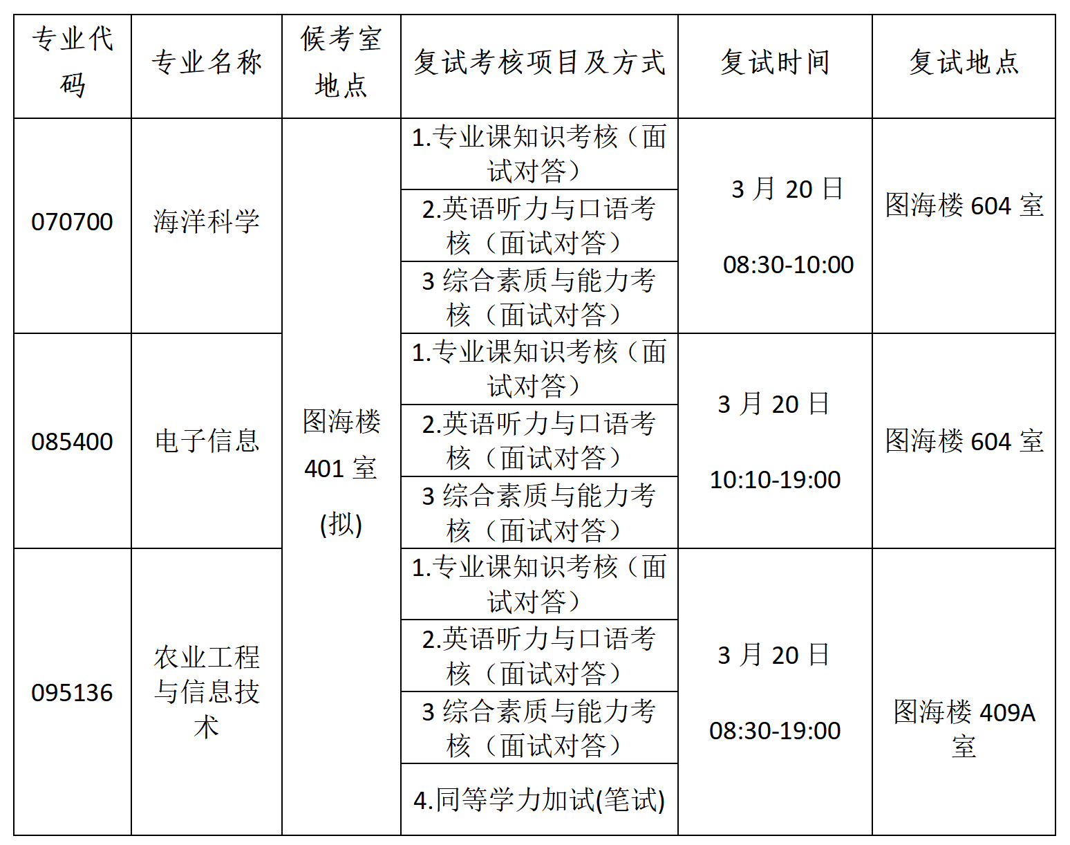 各专业复试时间、地点安排: