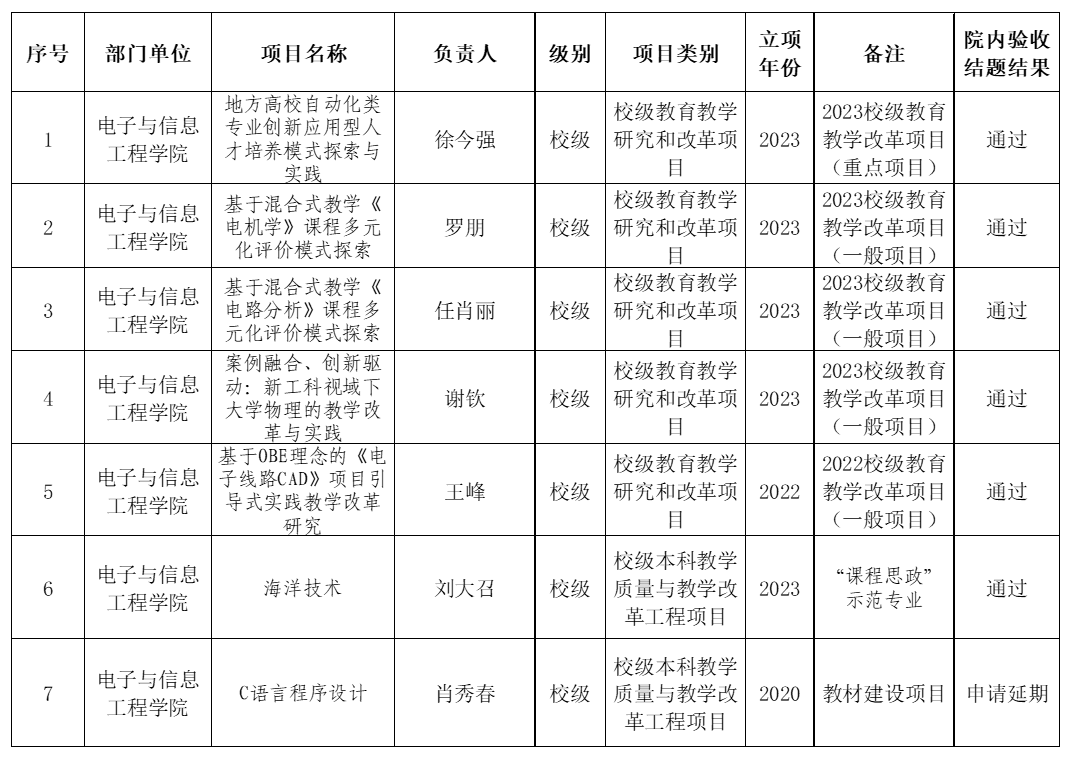根据《关于做好2025年度校级教学质量与教学改革工程项目结题验收工作的通知》和《关于做好2026年度校级教育教学改革项目结题验收工作的通知》要求,我院组织了校级“教育教学改革项目”和“教学质量与教学改革工程”项目2025年度结题验收工作。本年度共7个项目参加本次结题验收(其中5个校级教育教学改革项目,2个教学质量与教学改革工程项目)。经项目负责人自查、学院组织校内外专家评审,其中6个项目通过院内组织的结题验收,1个项目申请延期。现将验收结果予以公示,详见附件。如有意见,请在公示期间向学院提出。