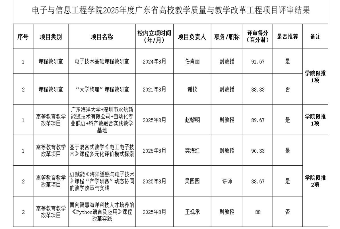 根据学校教务处《关于开展2025年度广东省本科高校教学质量与教学改革工程项目申报推荐工作的通知》【校教务(2024)89号】要求,经教师个人申报、资格审查、院外专家评审、学院党政联席会议研究同意等程序,现将我院教师申报的评审和推荐结果予以公示(详见电子与信息工程学院2025年度广东省高校教学质量与教学改革工程项目评审结果)。如有意见,请在公示期间向学院提出。